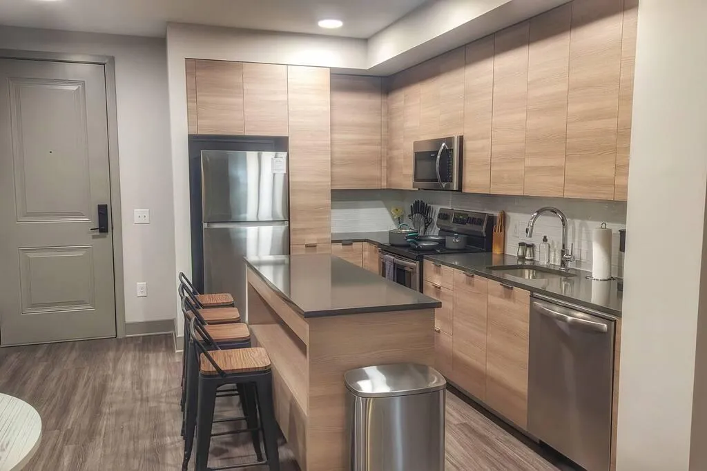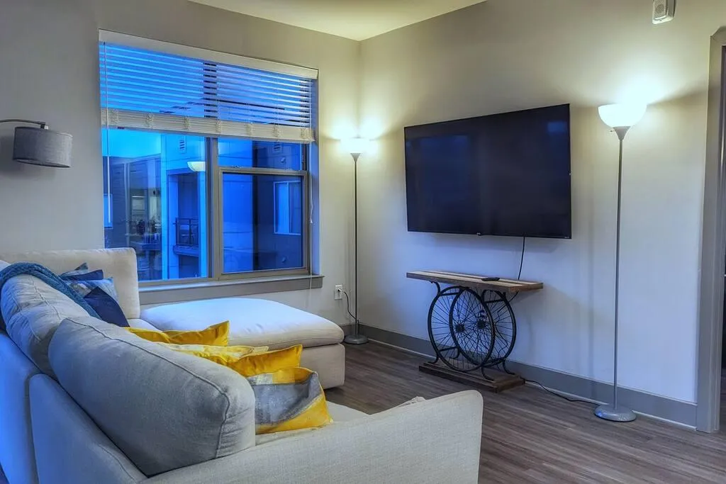The inviting living area includes a Roku TV, a fully equipped kitchen with island seating, and a washer/dryer for added convenience during your stay. Guests also enjoy access to the gym just steps away.